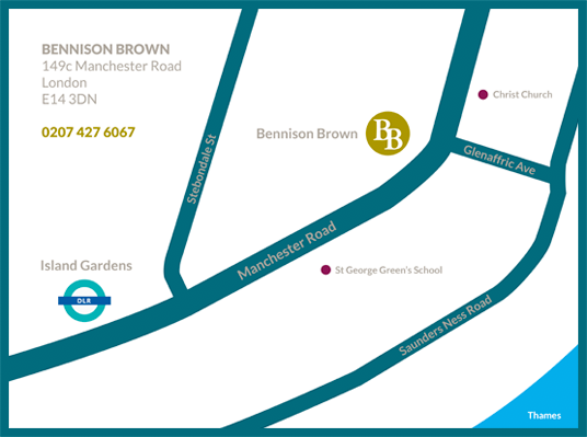 If travelling on the underground, simply turn left at Islands Gardens (DLR) and walk for two minutes until you get to our office.
